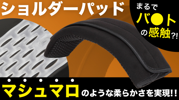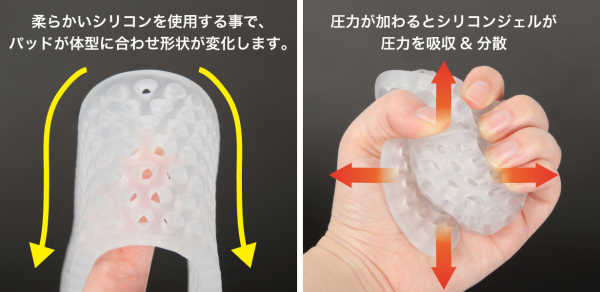 【シリコン内蔵 ショルダーパッド】は、マシュマロのように柔らかい、医療用グレードのシリコンを採用することで、これまでに無い弾性力・クッション性・伸縮力を持っています。