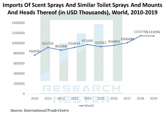 国際貿易センターの統計によると、香りスプレーと同様のトイレスプレーとそのマウントとヘッドの輸入の輸入は、2010年の760930千米ドルから2019年の1143096千米ドルに増加しています。