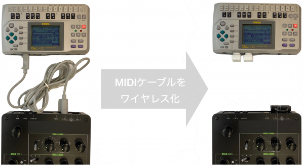 mi.1 Cableは、電源なしでMIDIケーブルをワイヤレス化する、世界初(当社調べ)のワイヤレスMIDIアダプターです。