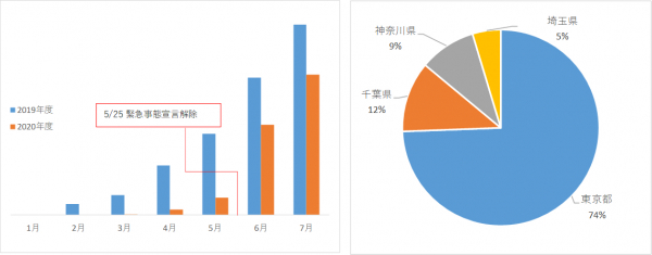 7月レンタル売上における「予約月別売上」と「都道府県別比率」(東京エリア)