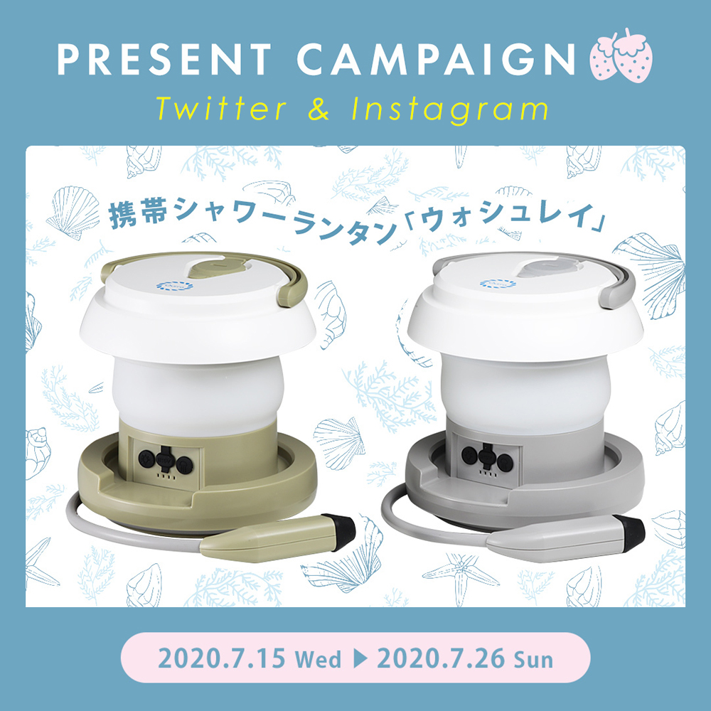 手洗いしたいときにすぐ使える携帯シャワーランタン「ウォシュレイ」を、抽選でTwitter・Instagramキャンペーンともに各10名様にプレゼントいたします。