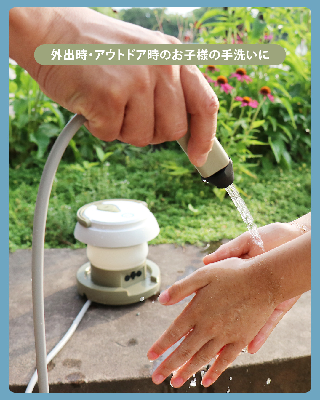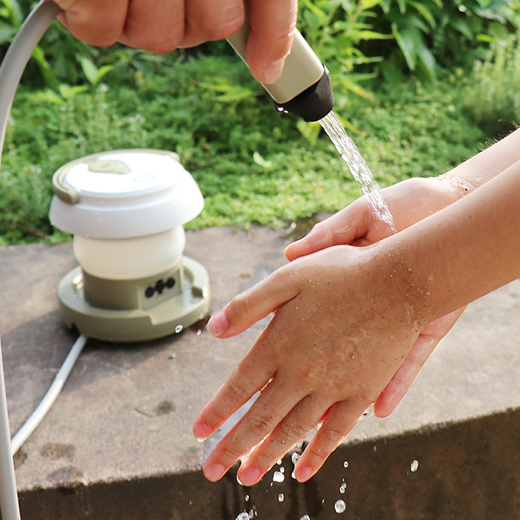 「汚れた手を洗いたいけれど水洗い場がない」「野外でも手洗いがラクにできたらいいのに」という要望を叶えるため、折りたたみ式・充電式のコードレス設計にすることで、携帯性の高さを実現しました。