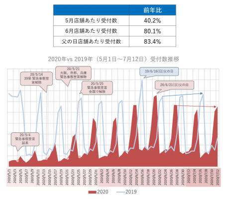 緊急事態宣言が全国で解除された5月25日以降は週を追う毎に前年との週末における受付数の乖離(山の高さの差)が徐々に縮まり、客足は回復基調にあることが伺えます。ただ6月のピークとなった父の日後3週間での推移を見た場合、6月最終週から7月第二週にかけての週末の推移を比較すると、前年の傾斜に比べ今年は6月最終週から7月第二週にかけては鈍化しており、このまま客足が戻るかどうかは今後一定期間注視が必要な状況にあると推察されます。