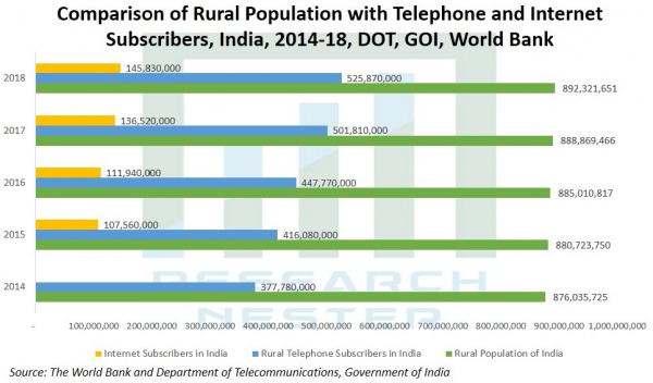 世界銀行が提供する統計によると、世界中の農村人口は、年平均0.80%の成長率で、1969年の2億2900万人から2018年の3億3900万人まで増加しました。時間の経過とともに、通信事業者は、顧客基盤を拡大し、サービスで顧客を充実させることにより、より多くの収益を生み出すために、農村地域にサービスを拡大しています。そのため、地方の人口の中で電話とインターネットの加入者が大幅に増加しています。インド政府の通信省によると、インドの農村部の電話加入者は2014年の3億7,783万人から2018年には5億2,587万人に、インドのインターネット加入者は2015年の107.56百万人から2018年には145.83百万人に増加しました。