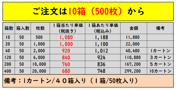 ◆包装方法 1箱/50枚入り、1カートン/40箱入り