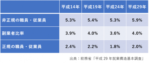 人口減少に伴って、労働の中核を担う生産年齢人口が減ることもあり、政府も推進している副業ですが、総務省「就業構造基本調査」の2017年度のデータによると実際に副業している人は全体の4%程度と少ない割合になっています。
