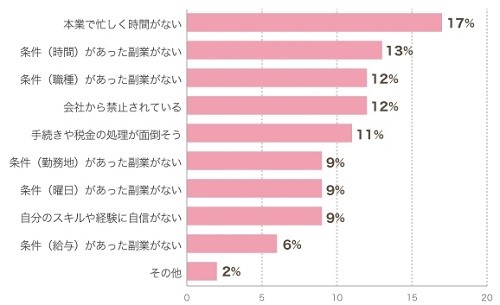 「はたらこねっと」ユーザー1,334人を対象にインターネットで行われた調査によると、副業をしない理由には、「本業で忙しく時間がないため」(17%)が最多となり、「時間があう副業がない」(13%)、「職種があう副業がない」(12%)、「自分のスキルや経験に自信がない」(9%)などがあがりました。