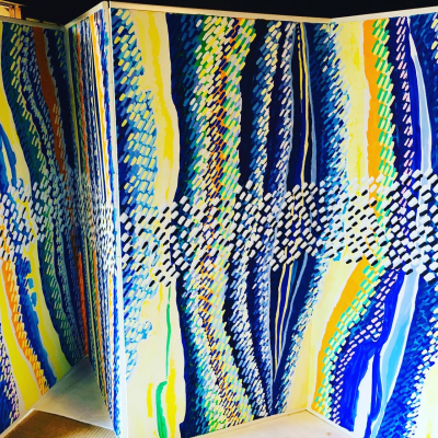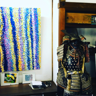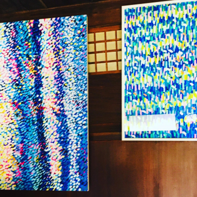たしかに無数に描き続ける斜めに入ったありとあらゆる色彩の点や線が、上昇する光をキャンバスいっぱいに表現しているこれらの絵の数々の前に立つと、圧巻でもあり不思議と魂の奥底から何かが喜びに満ち溢れているかのような感覚に襲われる。氏は、それこそが「上昇氣龍」の持つメッセージだという。
