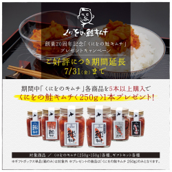 本キャンペーン期間中、くにをの鮭キムチ株式会社が運営する、「くにをの鮭キムチ 公式オンラインショップ」( http://shop-kuniwo-kimuchi.com )にて、くにをのキムチ商品各種を5本以上ご購入いただくと「くにをの鮭キムチ 250g」を1本プレゼントいたします。