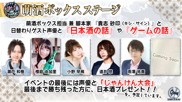 ◎「萌酒ボックス」日本酒アプリゲームの萌酒ボックス担当 兼 脚本家『貴志 砂印(キシ サイン)』と日替わりゲスト声優とコラボレーションし『日本酒の話』や『ゲームの話』を中心にトーク。<萌酒ボックス・出演者>・小野 早稀・道井 悠・櫻庭 由加里・雨澤 祐貴・瀬戸 和樹他。