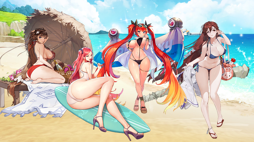 ※左から:「ダフネの優雅な水着」、「選手水着ナイトエンジェル」、「アトミックセクシーメイ」、「ヴァルキリー水泳準備中」