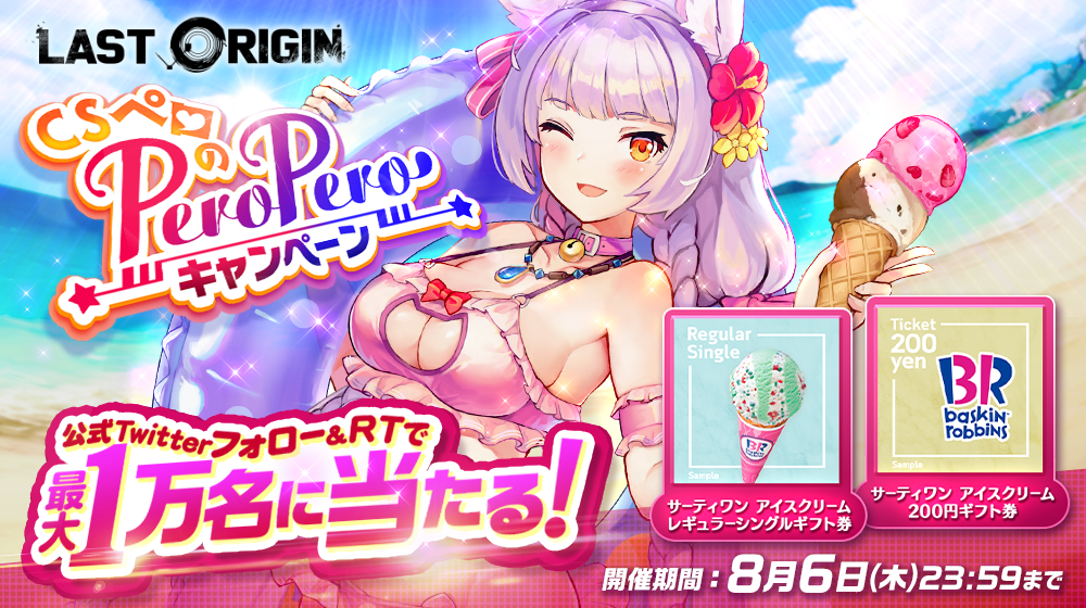 『ラストオリジン』の夏イベント開催を記念し、抽選で最大1万名に「サーティワン アイスクリーム ギフト券」が当たる『CSペロのPeroPeroキャンペーン』開催!