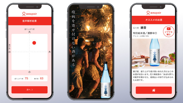 『継音』は疫病払いのお祭りの声から「歓びの声」だけをPFUの技術で抽出し、明るい未来を願う想いを込めて聴かせた日本酒です。『emopair』はオンライン飲み会に一体感を持たせてくれるアプリ。飲み会の会話内容や盛り上がりに合わせて様々な日本酒をおすすめしてくれます。