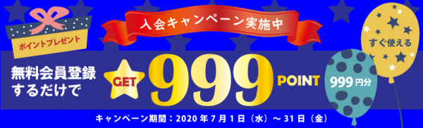 登録するだけで、いつでも使える999ポイントがゲットできる大変、お得なキャンペーンとなっています。