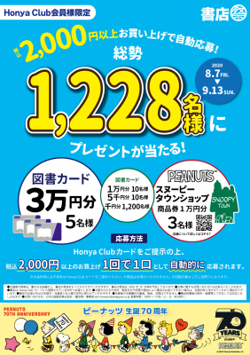 今回のメイン企画は、期間中に実施書店で2,000円(税込)以上のお買い物をすると、最大3万円分の図書カードや、全国のスヌーピータウンショップで使える商品券1万円分などが総勢1,228名様に当たるプレゼントキャンペーンです。