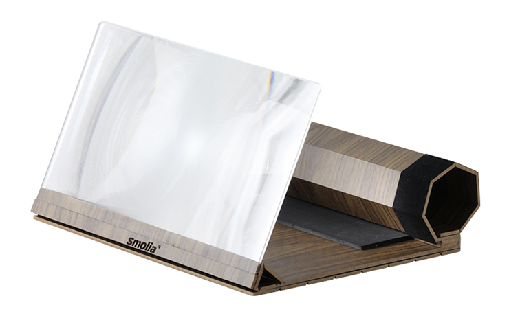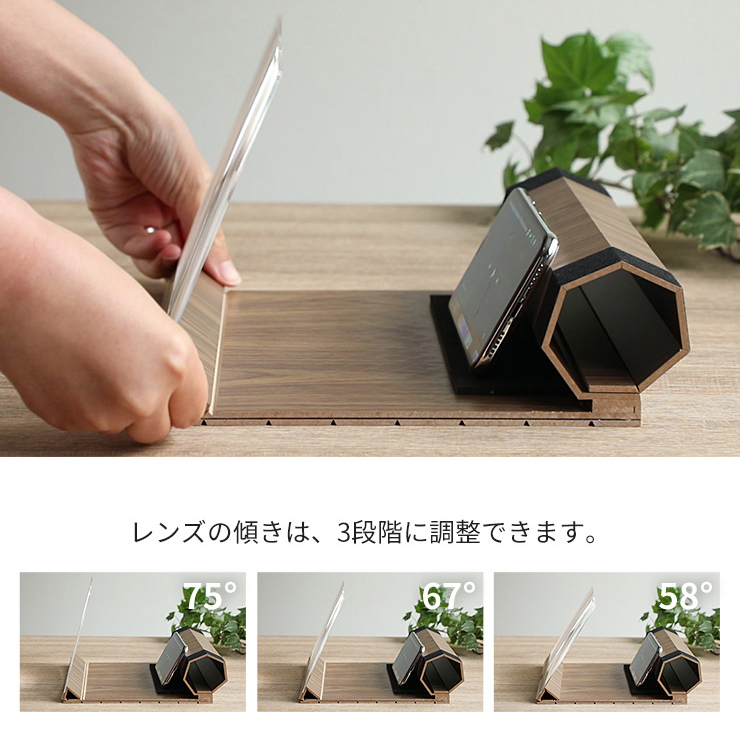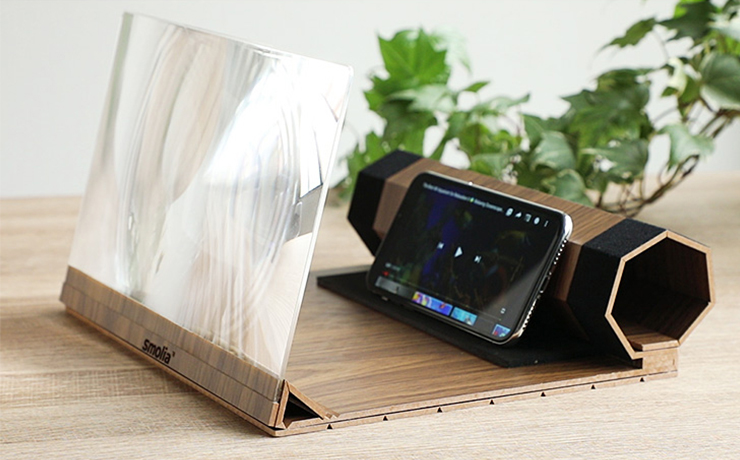 本製品を使えば、スマートフォンを置くだけで簡単に小さな画面がおよそ12インチの大画面になり、より臨場感のある動画を楽しむことができます。また、スモリアフォンは「見ごこち」にもこだわり、レンズの傾きや土台を見やすい角度に調整することが可能です。