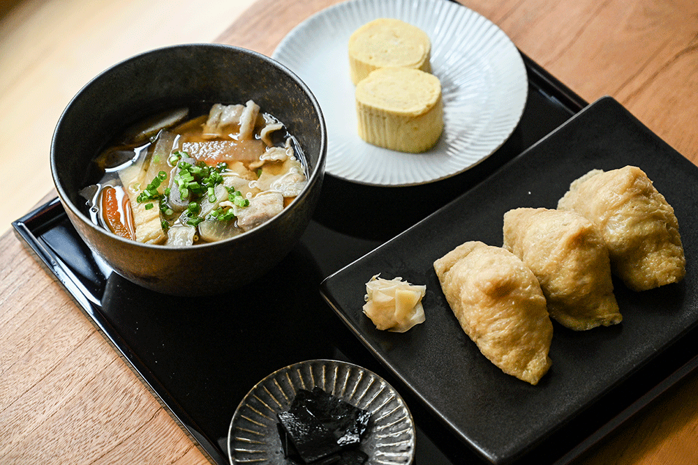 たんとおたべやす(京出汁おいなり3個、豚汁、だし巻たまご(2切)、付合せ) 930円税込