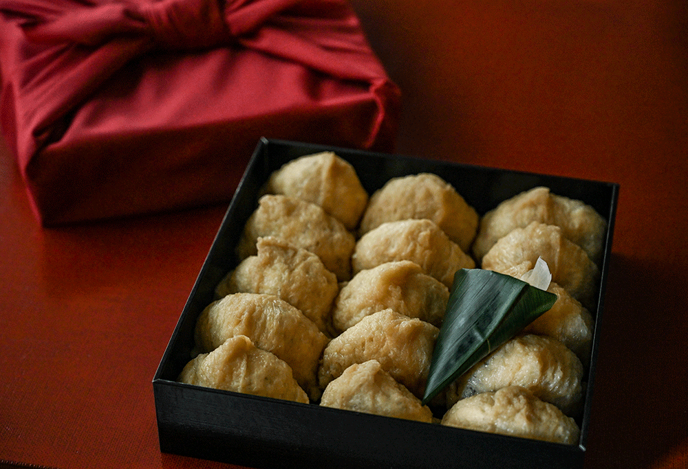 京都を代表する老舗豆腐店「嵯峨豆腐 森嘉」の油揚げと、北海道産真昆布・鯖節・鰯節・鰹節で丁寧に取った一番出汁を使用しております。 一口でじゅわっと京都を感じていただける、いなり寿司に仕上げました。