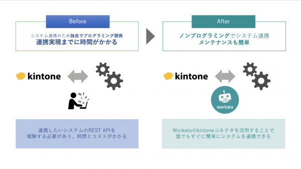 このたびリックソフトが開発したkintone コネクタは、Workatoのメリットを生かし、ノンプログラミングで誰でも簡単にkintoneと他サービスとの連携を実現します。また、プログラミングの知識がなくても連携できるため社内での構築やメンテナンスが可能となり、ビジネススピードの向上を実現します。