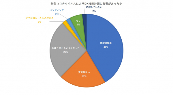 新型コロナウイルスによりDX推進計画に影響があったかという項目に、25%以上が急務と感じていると回答し、さらに、すでに推進に向けてシステム等を導入した企業は1社ありました。