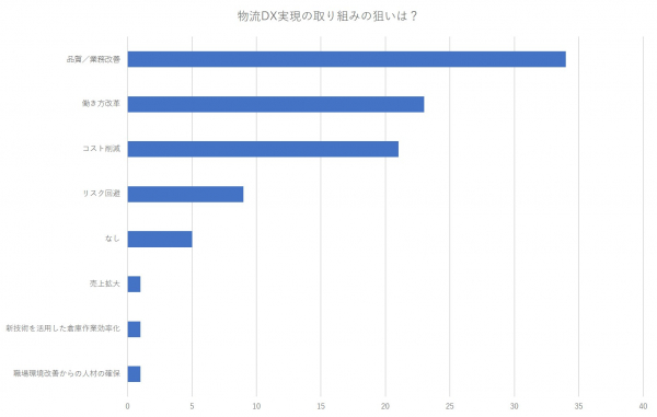 DX実現の狙いとしては、品質/業務改善が最も多く総回答数の1/3以上、働き方改革・コスト削減が続きました。