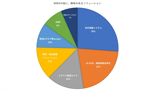 最新のWMSと合わせて検討しているソリューションとして、音声認識システムがトップ、次いで物流バックオフィスのリモート化実現ソリューションAI-OCRがあがりました。