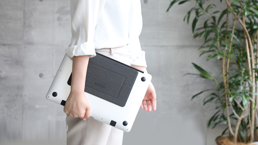 ・スタンド使用時にタイピングなどでパソコンがズレにくいよう、滑り止めシール付属
