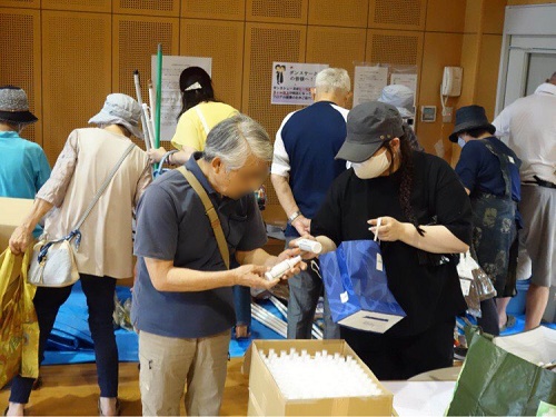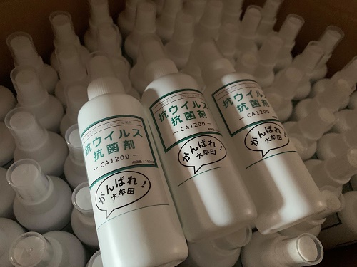 キャンディルテクト社員が100mlボトルに小分けし、「がんばれ!大牟田」の応援メッセージ入りステッカーをボトル1本1本に思いを込めて貼り、2,070本を発送させていただきました。