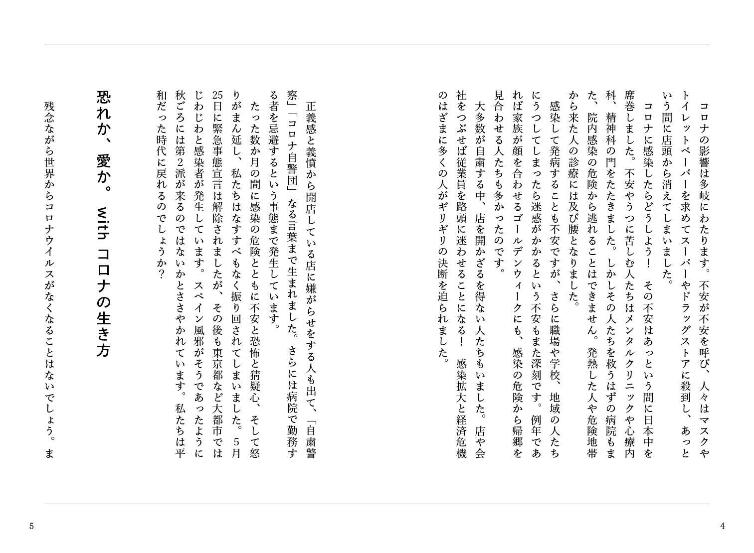 本書は、withコロナの世界を「思いやり=慈愛」の世界にするための前向きな提案と、