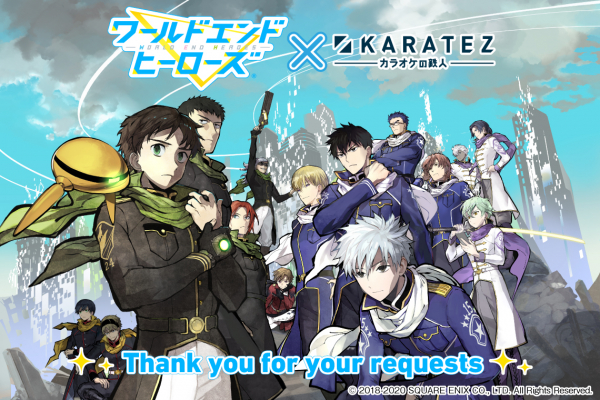 株式会社鉄人化計画(所在地:東京都目黒区 代表取締役社長:岡﨑 太輔)は、当社が運営する「カラオケの鉄人」の首都圏6店舗において、株式会社スクウェア・エニックス(所在地:東京都新宿区 代表取締役社長:松田 洋祐)のアプリゲーム「ワールドエンドヒーローズ」とのコラボレーションキャンペーン(以下「コラボ」)を、2020年8月13日(木)より開催します。「ワールドエンドヒーローズ」と「カラオケの鉄人」のコラボは2018年11月に続く2回目です。今回は、「カラオケの鉄人」が2020年4月から6月の間にファンから募ったコラボリクエストにおいて、「ワールドエンドヒーローズ」へのリクエスト数が1位になったことから開催に至りました。ファンへの感謝の気持ちを込め、「ワールドエンドヒーローズ×カラオケの鉄人~Thank you for your requests~」と題します。