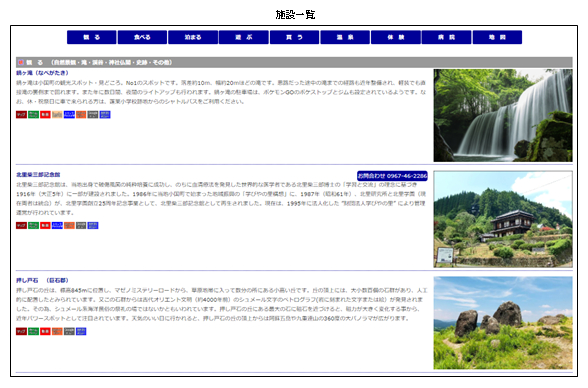 ● メニューの「施設一覧」から各カテゴリー(業態)別に、すべての施設・店舗の情報が一覧表示されます。また、各施設・店舗別に簡単な案内文も同時に表示されます。さらに、施設一覧内の各施設・店舗別に関連するサイトへのリンクボタンが設置してあります。また、そのボタンには、地図へ移動する“マップボタ”も設置してあり、ワンクリックでその施設の地図に簡単に移動できます。
