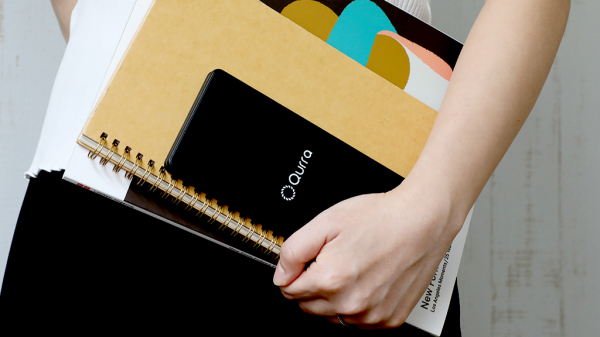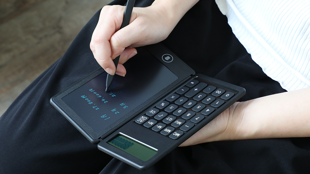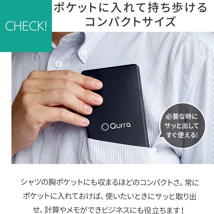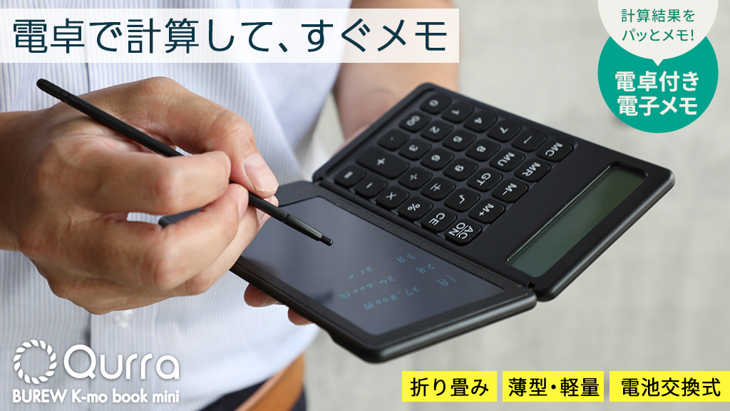 企業のコスト削減や環境保護の面から需要の高まっている「電子メモパッド」に電卓を搭載することで、経費精算などメモを取りながらの複雑な計算作業に適した「Qurra BUREW K-mo book (Qurra ブリュー ケーモ ブック)」。実際に使用したユーザーの声を元に、さらに持ち運びやすいコンパクトサイズを開発しました。