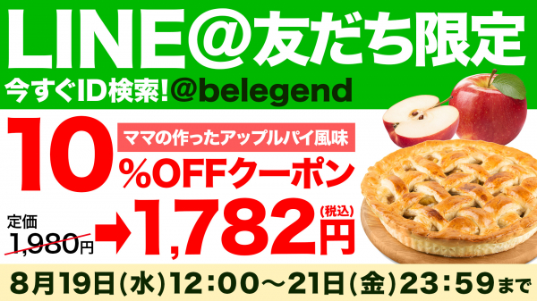 ◇キャンペーン内容: ビーレジェンド公式LINEに登録するだけで、ビーレジェンド プロテイン ハローキティ ママの作ったアップルパイ風味を10%オフで手に入れることが出来ます。