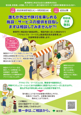 東京都産業労働局観光部では、国内外から多様な旅行者を迎えるに当たり、障害者や高齢者等が安心して都内観光を楽しめる、アクセシブル・ツーリズムの充実に向けた取組を推進しています。つきましては、令和2年8月18日より施設のバリアフリー化や接遇サービス等の向上に取り組む事業者の方で、相談員の派遣を希望される方を募集いたします。