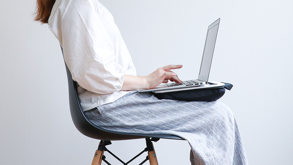 また、脚に接触する面が柔らかいため、機器を置いて使用した場合の荷重を分散できる上、機器の熱が直接伝わるのを防ぎ、ソファ等でくつろいだ姿勢のまま、ベストポジションで快適に作業することができます。