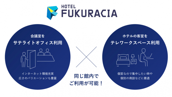 会議・研修に特化した「ホテル」フクラシアが、その強みを活かした「オフィス」向けプランを積極展開いたします。ホテル内会議室や客室をオフィス、ならびにテレワーク(個室)スペースとして利用いただけるプランです。会議や研修というビジネスシーンに特化したホテルの強みを活かした、使いやすいオフィス設備と、計算されたフロア導線などが特徴。2020年8月末よりオフィス利用ご契約者様向けに「日替わりランチ」のご提供も開始いたします。昼食時に外出したり、密集した場所を訪れたりすることで発生する、感染症のリスクの回避につながります。働く場所として最適な環境で、ニューノーマル時代、働き方改革、オフィス分散などの社会課題にお役立て頂けます。