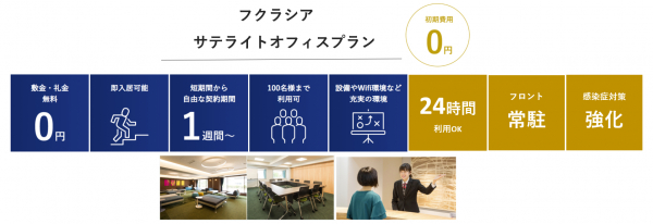 通常のオフィス契約は年間契約になる場合が多く、柔軟な働き方が求められる今の時代においてご契約のハードルは高いのではないでしょうか。フクラシアのプランなら、初期費用(敷金・礼金)無料、煩わしい手続き不要で、即入居いただけます。