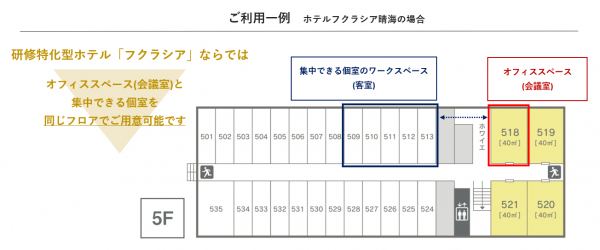 複数人で集合する「オフィス(会議室)」と、集中できる「個室(客室)」を導線の良い館内でご用意できます。