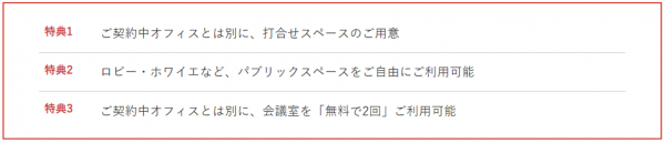 ご契約いただくオフィススペースとは別途、打ち合わせスペースや、150m2程度の会議室の「無料」利用を特典としてお付けしております。お客様をお迎えしての商談や、定期的に各所から集まる会議などにご活用いただけます。