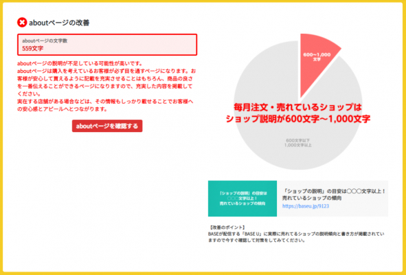 例えばショップの紹介ページではBASE Uでは売れているショップの説明は600~1,000文字が目安と記載されていますが、SEOマスターfor BASEでは紹介ページの文字数を手軽にチェックすることができ、改善が必要な場合、本画面アドバイス、さらにBASE Uでの記事を参考にしていただける仕様となりました。