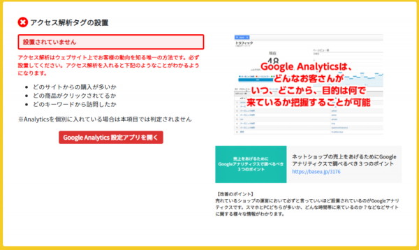 上記の結果を踏まえ、SEOマスターforBASEでは、まずアクセス解析機能が有効になっているか、Google Analyticsの設置チェック機能によって集客改善のための一歩目をサポートする機能を実装いたしました。