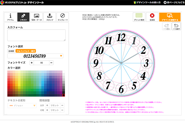 写真プリント時計は、「デザインツール」を使ってお手持ちのデータをアップロードするだけで簡単にご注文頂くことができます。また、プリントデータをお持ちでない方も、「デザインツール」内のフォント、スタンプツール、デザインテンプレートを使って、その場でデザインすることが可能です。文字盤の配置がしやすいガイドラインや、テンプレートデザインもご用意しております。注文前に仕上がりイメージが確認できる安心の機能付きです。
