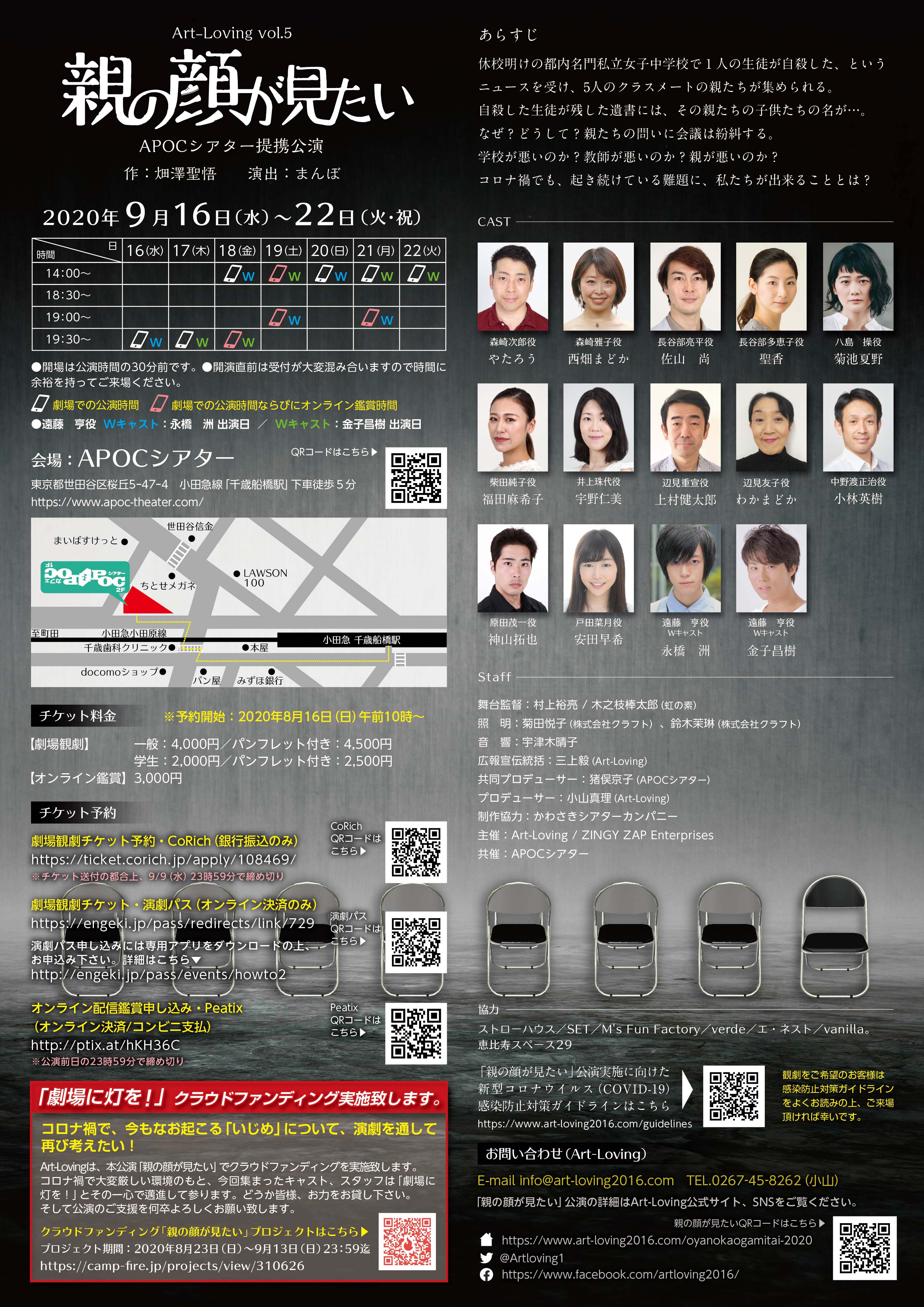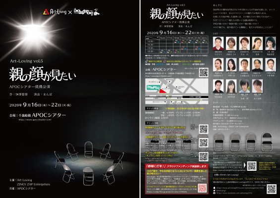 Art-Loving(代表 小山裕嗣)は、2020年9月16日(水)から22日(火・祝)まで7日間、全10ステージを千歳船橋APOCシアターと提携公演として、Art-Loving vol.5「親の顔が見たい」を上演いたします。