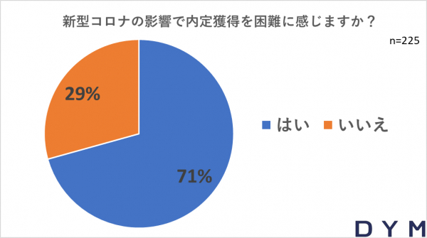 その中で、「新型コロナウイルスの影響で内定を獲得することが困難に感じますか?」という設問に対し、71%の学生が、困難に感じると回答をしました。