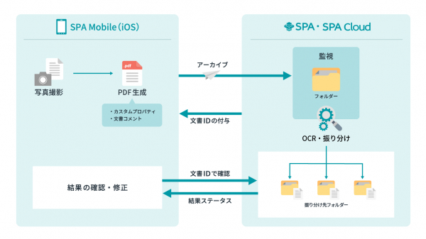 今回のリリースでは、iOS端末に対応したSPA MobileをApp Store上で提供開始します。SPA Mobileは、スマートフォンで撮影・保存された画像ファイルをPDFファイルの文書としてアーカイブするアプリケーションです。アーカイブされた文書はSPAのAI-OCR機能により読み取り可能で、手書き伝票を含む定型帳票をその場で撮影し読み込むことにより、後から発生する入力などの手間を削減します。またスマートフォンで撮影した領収書などの電子帳簿保存法対応も可能となります。
