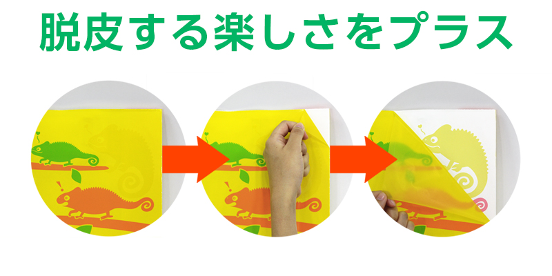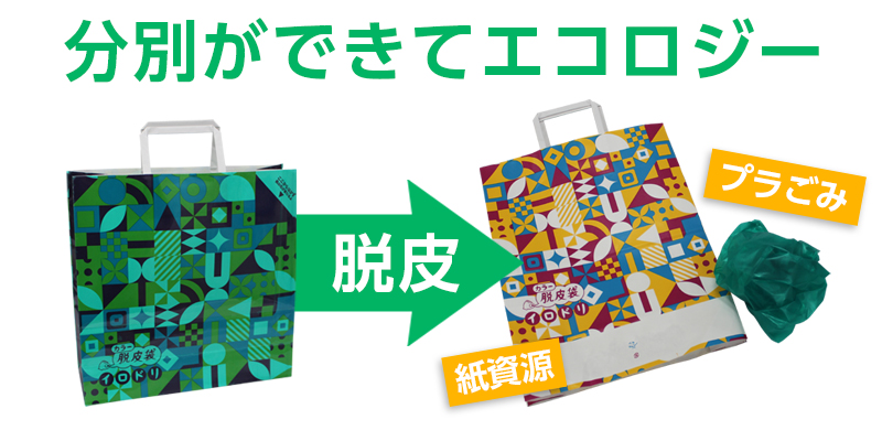 通常の「脱皮袋(R)」同様、使用中は表面に貼られたポリフィルムが水や汚れから紙袋を守り、使用後は、ポリフィルムをスーッと剥がす際に起こるデザインや色の変化を楽しんでもらいながら、プラスチックゴミと資源となる古紙に分別してもらえる、今後大注目の製品です。