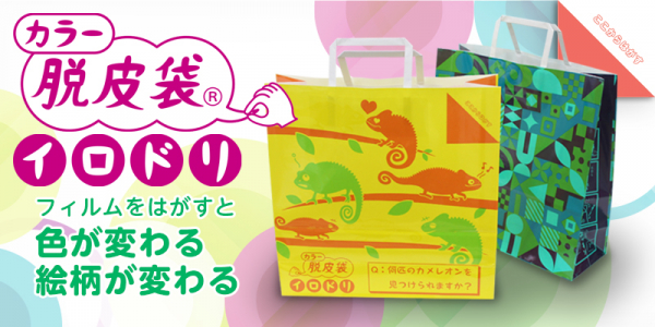 通常の「脱皮袋(R)」同様、使用中は表面に貼られたポリフィルムが水や汚れから紙袋を守り、使用後は、ポリフィルムをスーッと剥がす際に起こるデザインや色の変化を楽しんでもらいながら、プラスチックゴミと資源となる古紙に分別してもらえる、今後大注目の製品です。