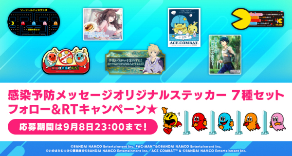 株式会社バンダイナムコエンターテインメントは新型コロナウイルス感染症拡大を防止するため、8月4日(火)より、公式SNSにてさまざまなキャラクターなどが登場する感染予防メッセージを配信しています。本日9月1日(火)からはオリジナルステッカーのプレゼントキャンペーンを開始します。