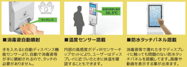 これらの機能に加え、タッチパネルディスプレイで様々な情報提供が可能になります。防水タッチパネルになっており、消毒液等で濡れた手でディスプレイに触っても問題がなく、画像や動画を表示できます。