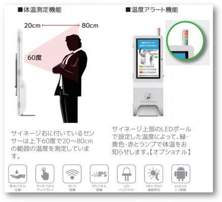 オプショナルで、サイネージ上部にLEDポールを取り付け、設定した温度によって緑・黄色・赤のランプで体温を知らせる機能も付けられます。